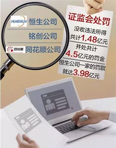 根據(jù)公告,恒生、銘創(chuàng)、同花順等3公司,因涉嫌非法經(jīng)營證券業(yè)務,獲取非法收益,嚴重擾亂證券市場秩序。證監(jiān)會依法沒收涉事3公司違法所得達1.5億元,處罰金共計近4.5億元,并對相關責任人員給予警告和罰款。消息一出,有媒體將之稱為“最狠罰單”。