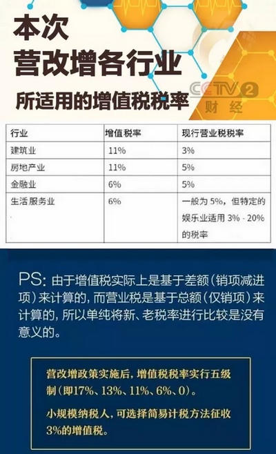 5月1日“營改增”全面推開,建筑業(yè)、房地產(chǎn)業(yè)、金融業(yè)、生活服務(wù)業(yè)將告別營業(yè)稅。這項看起來“高大上”的改革,涉及近千萬戶新納稅人、全年減稅超5000億元。營業(yè)稅退出歷史,你我能獲多大好處?