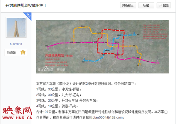 【傳聞】11月初,網(wǎng)絡上謠傳“開封要修建地鐵,市區(qū)內規(guī)劃了4條線路”不少開封市民在網(wǎng)上看到一則關于開封要修建地鐵的消息,引來一片熱議,同時市民在論壇上也有發(fā)帖熱議。