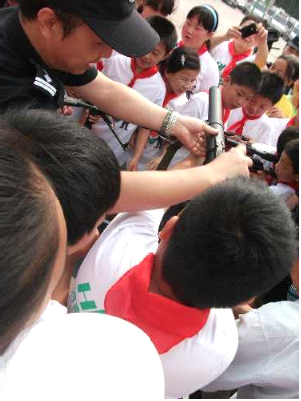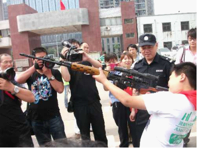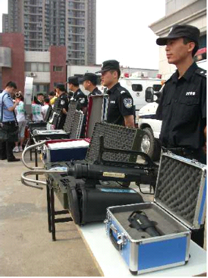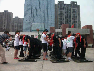 5月31日上午,鄭州市公安局特警支隊(duì)大院里熱鬧非凡,35名小學(xué)生成為這里的特殊客人。在特警支隊(duì)副隊(duì)長弋遂勤的帶領(lǐng)下,大家興致勃勃地逐一體驗(yàn)了各類防暴器械,觀看武警戰(zhàn)士的絕技表演。特警四大隊(duì)演示的警棍盾牌術(shù)剛毅雄壯,特警新警大隊(duì)的新式擒敵拳颯爽英姿,當(dāng)備戰(zhàn)“2012全國公安特警比武”的特警猛士一口氣搬起二百斤的巨型輪胎時(shí),大家不由得發(fā)出一陣驚呼!