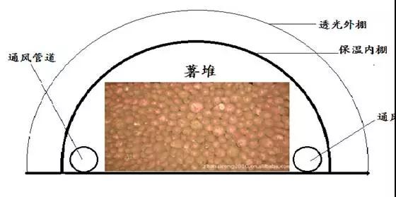 由塑料大棚外棚和內(nèi)部保溫棚組成,利用透光外棚獲取太陽能熱量為薯堆加溫,內(nèi)棚用保溫材料覆蓋,在夜間能夠保持薯堆熱量,可用通風(fēng)管道對內(nèi)棚進(jìn)行補(bǔ)充新鮮空氣與熱量交換,達(dá)到安全越冬的目的。在貯藏初期氣溫偏高,讓薯堆風(fēng)吹日曬10-15天進(jìn)行自然愈合,提高貯藏的安全系數(shù)。