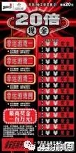 “20倍現(xiàn)金”單張彩票共有20次中獎機(jī)會,最高獎金100萬元。票面共有五組游戲,簡單易玩、新鮮刺激。其中,主游戲為:刮開覆蓋膜,在任意一場游戲中,如果你的號碼與中獎號碼相同,即中得該場游戲右方所示的金額;如果在任意一場游戲中,出現(xiàn)倍數(shù)標(biāo)志“2X,3X,5X,10X或20X”,即中得該場游戲右方所示金額乘以該場游戲所出現(xiàn)的倍數(shù)。其它四場幸運(yùn)游戲分別為:在幸運(yùn)游戲區(qū)刮開覆蓋膜,如果出現(xiàn)兩個相同的標(biāo)志,分別可中得50元、100元、200元和500元。所有游戲中獎獎金兼中兼得。
