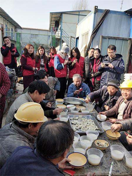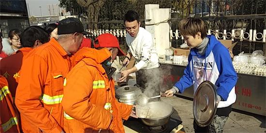 另一邊,在鄭州市花園路廣電南路交叉口,主持人劉雯和韓佳帶著十幾名義工早早的在路邊就開始忙活了。他們要給附近50多名環(huán)衛(wèi)工人煮餃子。平時,環(huán)衛(wèi)工們的午飯都很簡單,甚至都是隨便對付的,這次,主持人和義工們特意選在離工人們中午休息比較近的地方,搭起了臨時的灶臺,給工人們做上一頓熱騰騰的餃子。由于條件簡陋,臨時灶臺上的火十分不穩(wěn)定,劉雯和韓佳脫下厚重的外套,擼起袖子親自生火,費了好大勁終于把餃子下鍋了。吃上熱騰騰的餃子,環(huán)衛(wèi)工人們特別開心。一位老大爺由衷的感嘆道:“好久沒吃過這么暖心的午飯了,謝謝你們?!?/p>