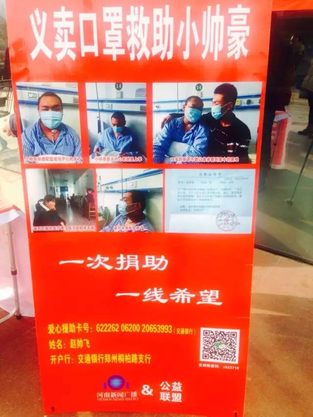 河南新聞廣播持續(xù)關(guān)注16歲白血病少年趙帥豪籌集50萬元移植費的進展。由我們和公益同盟一起發(fā)起的口罩義賣活動仍在進行中。在花園路丹尼斯義賣點,王女士帶著自己12歲的兒子柳義獻上了一份愛心。