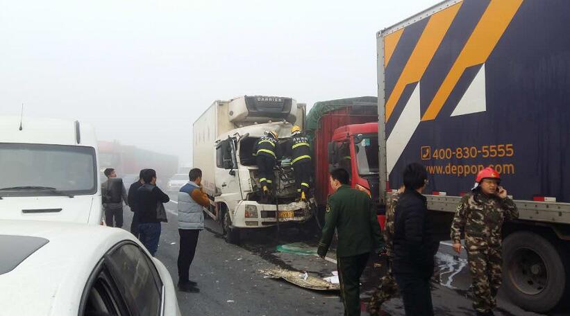 據(jù)現(xiàn)場郭先生描述:大概有4輛貨車,1輛中巴車,4輛私家車連環(huán)追尾,他就在這幾輛事故車后方,當(dāng)時(shí)受大霧影響,能見度50米左右,前方堵車,結(jié)果這幾輛車都沒剎住,直接相繼撞上了,郭先生說“幸虧當(dāng)時(shí)我車速不算快,及時(shí)把車剎住,不然前方就是一輛貨車,撞上去的話后果不堪設(shè)想,現(xiàn)在我的手都是抖的,太恐怖了”。