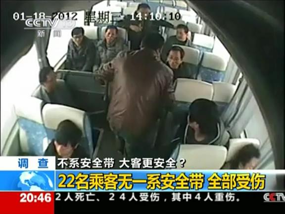 一段浙江交警提供的畫面顯示,在一輛大客車上,由于乘客未系安全帶,在車禍發(fā)生瞬間,全部被撞飛,造成1死21傷。